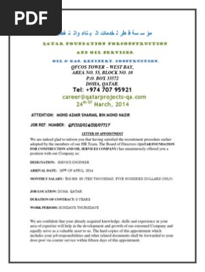 Letter Of Appointment Made By Qatar Foundation For Construction And Oil Services 1 Qatar Security Clearance